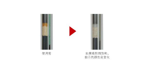 島津超凈過濾器設計了易于讀取的指示劑,當吸附劑飽和需要更換濾芯時會有顏色變化。