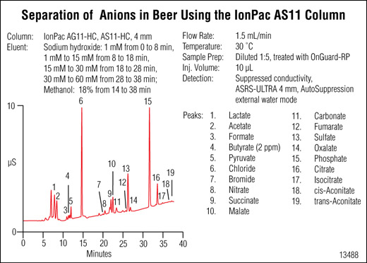 Dionex IonPac AS11-HC column used for the analysis of beer spiked with 2 mg/L