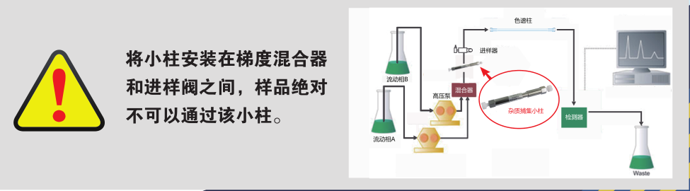 1、使用時將雜質捕集小柱安裝在梯度混合器和進樣器之間,請確保小柱安裝在進樣器之前,如果安裝在進樣器之后,會對樣品有強烈的吸附作用。