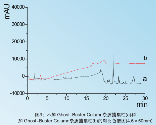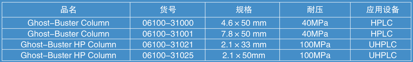 答:一般Ghost-Buster Column是連接在混合器和進樣器之間,4.6*50mm規格的體積是400ul,對常規檢測的影響不大,如果有影響,請將連接到混合器或者切換閥前水相通道。